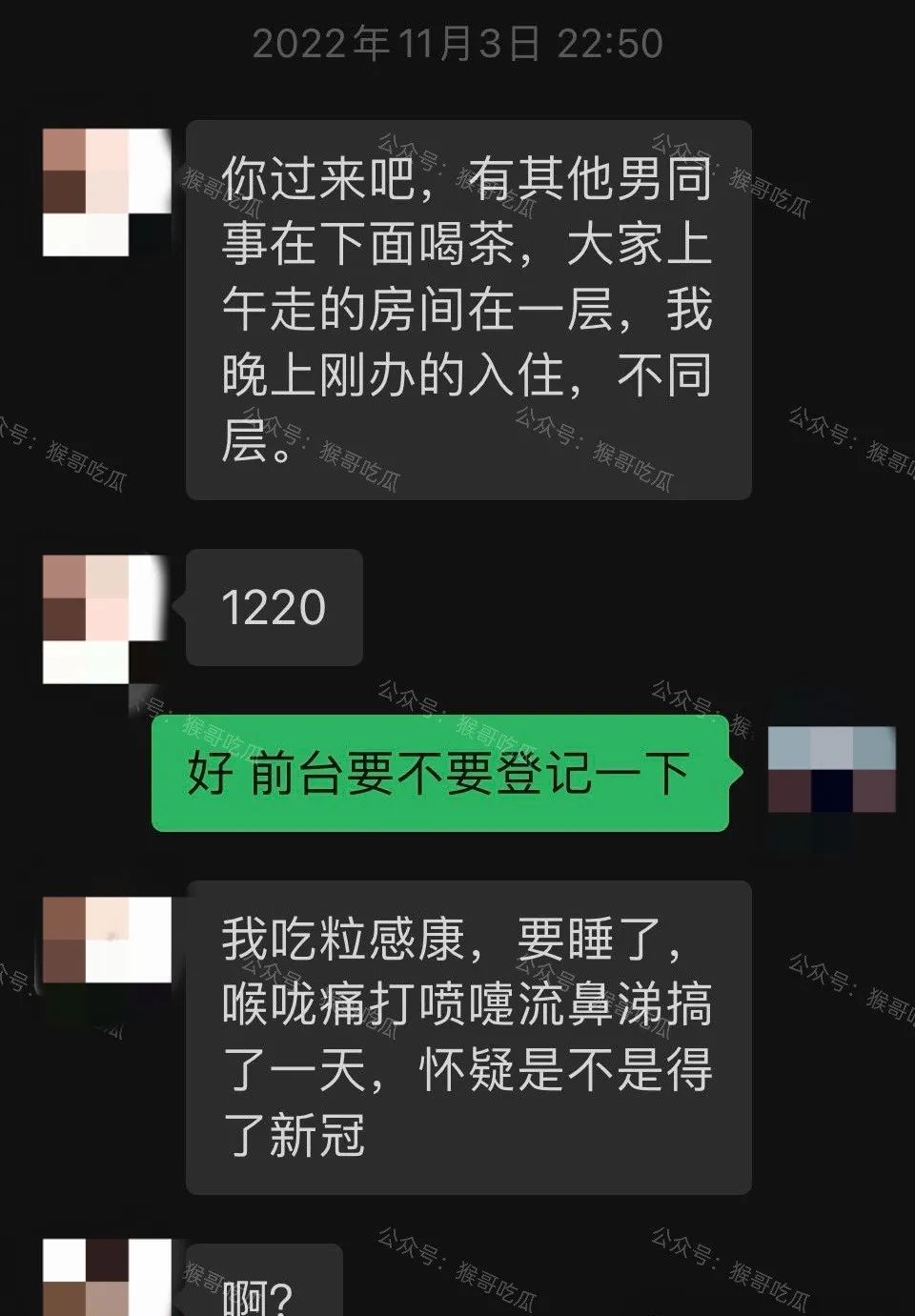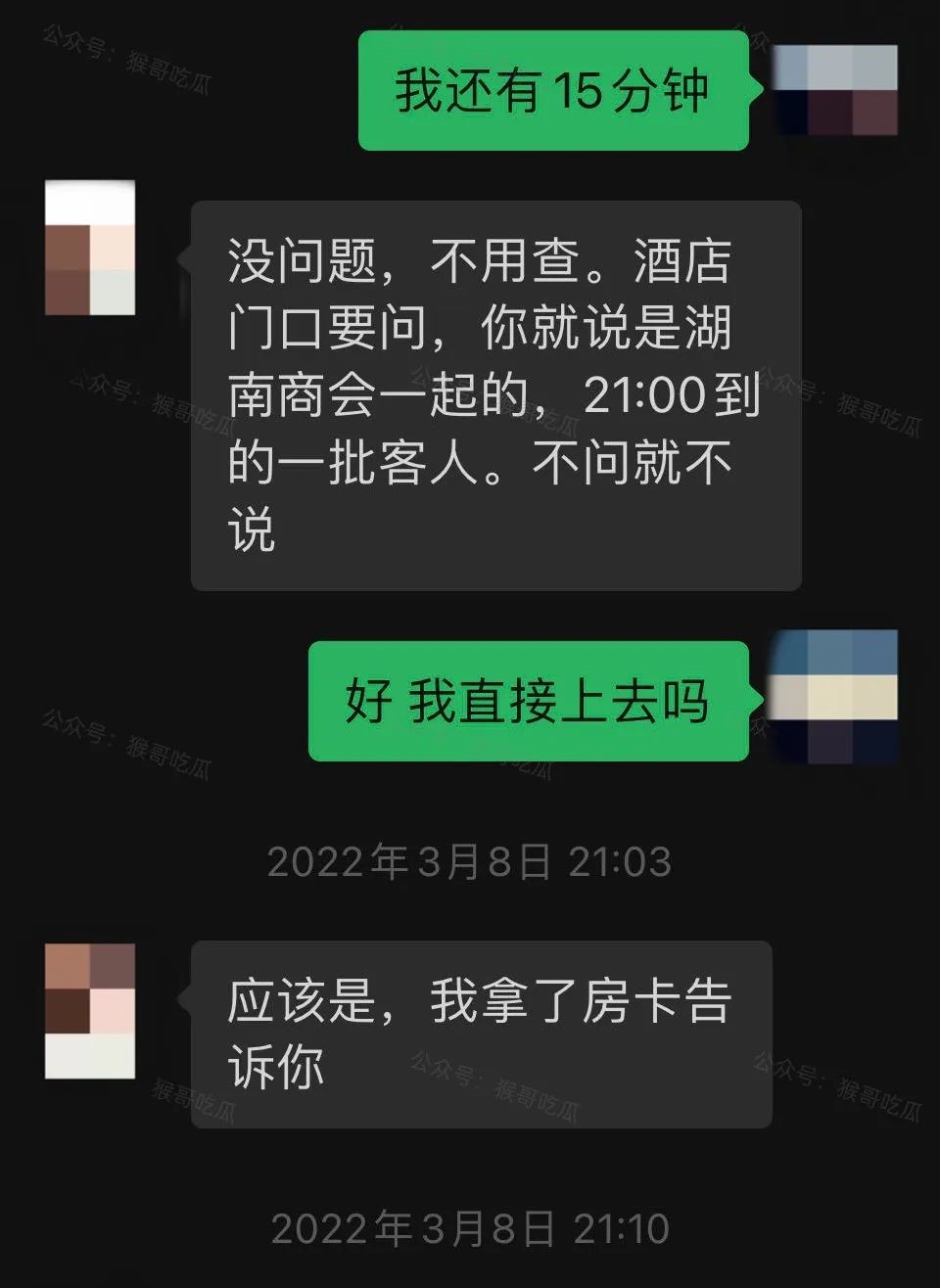 截图显示二人约会取房间的对话。
