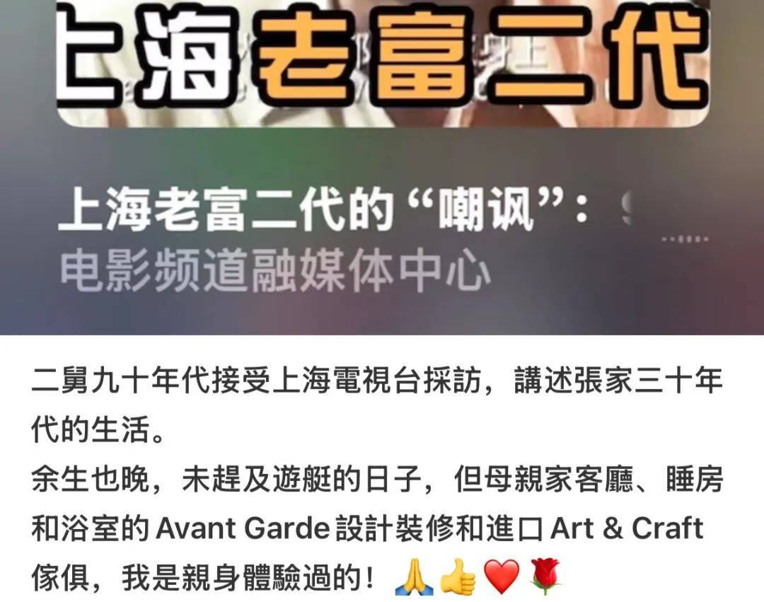 张原孙回忆从前富贵生活,父亲张祖安,老早已经有游艇了,游艇很大,后面还拖两艘快艇,每艘游艇可乘6人,从外白渡桥开进来,浪花直溅到身上来。在上世纪三十年代,张家已经有中央空调了,他爱唱京戏,凡是来听的人都送一罐味精,还有他日常样样喜欢外国货,只有衣裳要穿中式的——这是当年的一种风尚。