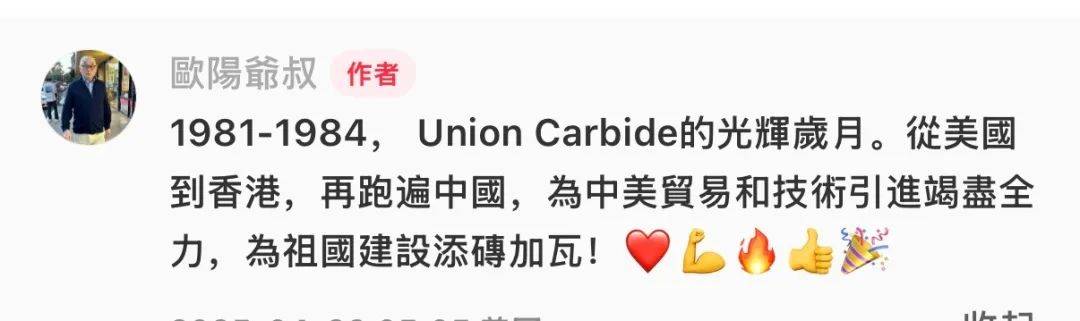 八十年代初,欧阳爷叔看准机会,他是以联合碳化物公司(Union Carbide)首席代表身份被派到上海的。