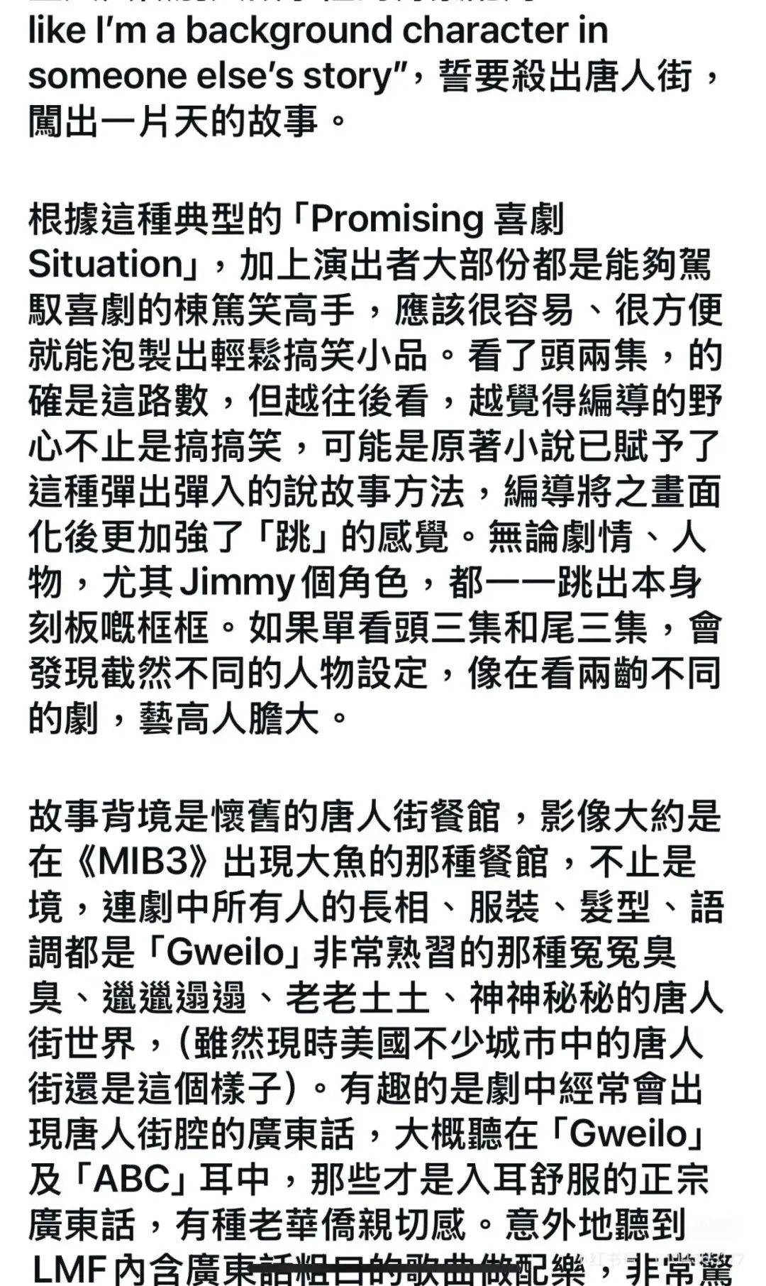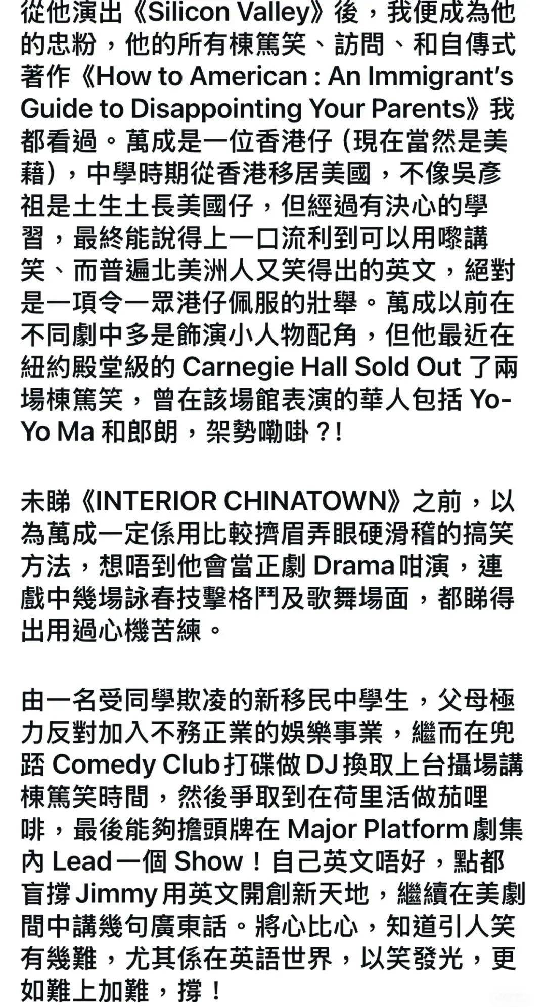 香港知名电影人、编剧、喜剧人谷德昭称吉米是他心中的HERO,因为知道华裔在美国混出头有多难,还要自己担纲剧集,“将心比心,知道引人笑有几难,尤其是在英语世界中,以笑发光,更加难上加难”。