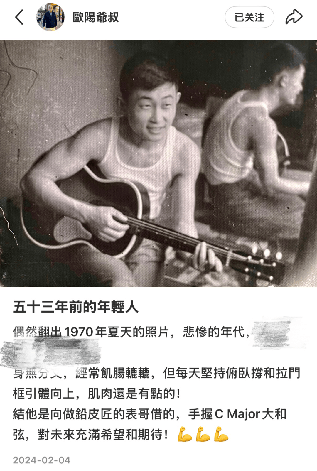 早在2023年底就以“欧阳爷叔”之名开始探索小红书,比儿子吉米足足早了一年多,他的小红书生活充满烟火气,到处品尝美食,闲时画画,做饭给家人,见朋友,演戏,与家人聚会,还和年轻一代们玩在一起,充分参与了儿子的演艺生涯,生活丰富得让人眼花缭乱。