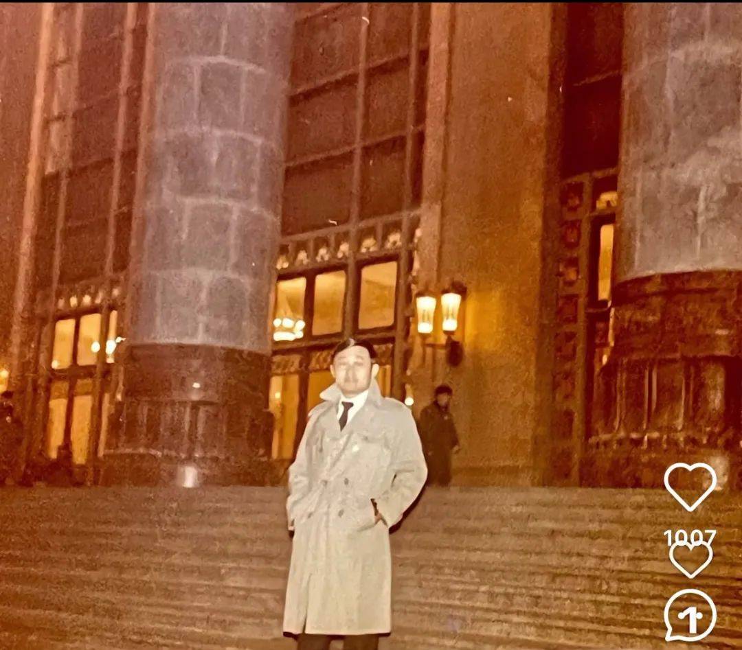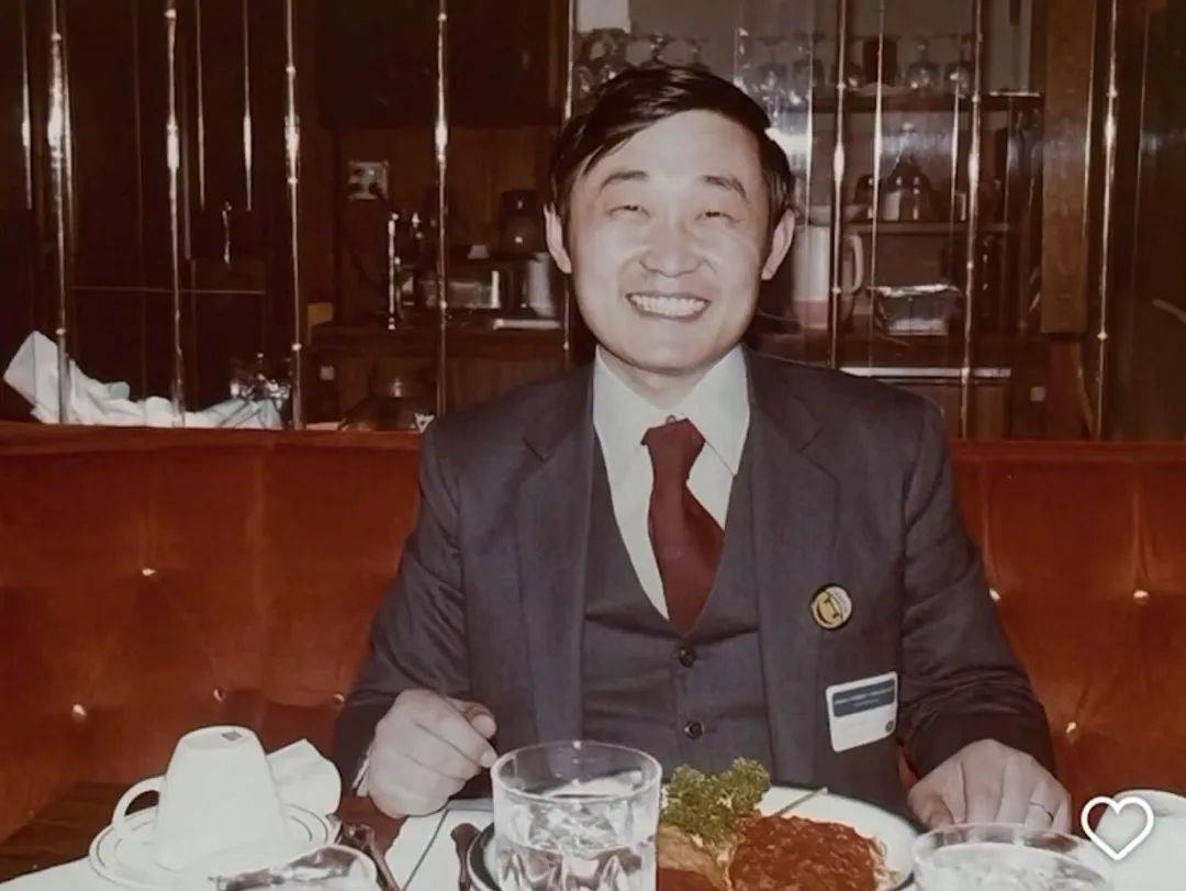 ▲ 上世纪80年代初的欧阳少均,穿三件套西装,吃西餐。