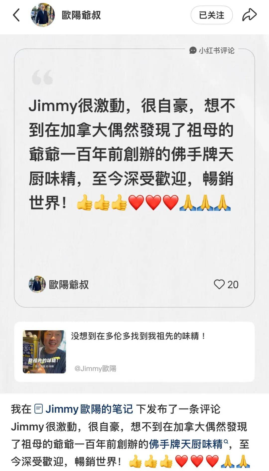 ▲ 吉米在自己的小红书上推荐过祖上出产的味精,这个牌子海外很多华裔都在用。