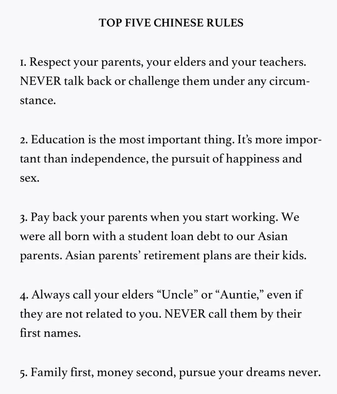 吉米太知道如何做好亚洲小孩,他总结过五条原则,极精辟:第一,任何情况下不要挑战父母长辈。第二,教育最重要,胜过独立、幸福和性。第三,你生下来就欠父母,工作后要报答父母,你就是父母的养老金。第四,即使没有任何亲戚关系,也要叫长辈叔叔阿姨。第五,家庭第一,金钱第二,永不追梦。