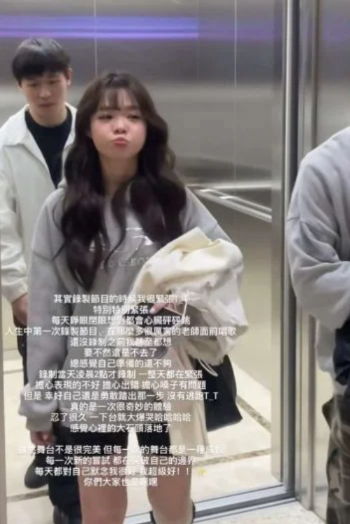 苡慧随后也在社交平台分享参与节目的感想,透露这是她首次录制大型节目让她焦虑到“睁眼闭眼都在心跳加速”,坦言在那么多很厉害的老师面前唱歌,“还没录制之前我甚至都在想要不然还是不去了,总感觉自己准备的还不够。”