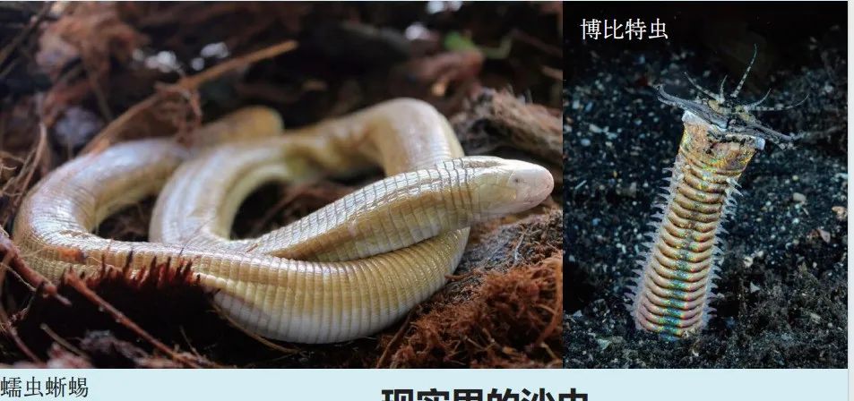 现实中也有类似沙虫的生物。比如蠕虫蜥蜴,它们生活于地下,身体细长,四肢退化,鳞片呈环状排列,外表像蚯蚓,却拥有强大的牙齿和下巴。还有博比特虫,它们没有眼睛,身体被坚硬的外骨骼覆盖;博比特虫会潜伏在海底沉积物中,当猎物靠近就勐然出击,用锋利的口器将其撕碎。不过,它们都没有沙虫那样的庞大体型,蠕虫蜥蜴体长从10厘米到70厘米不等,博比特虫最大能长到3米长。