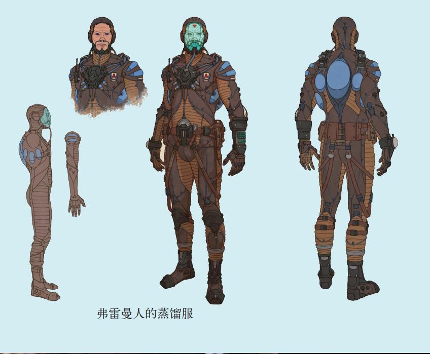 在弗雷曼人眼里,水比香料宝贵得多。他们制造捕风器,从大气中收集稀少的水分,还发明了特殊的蒸馏服,这种服装能收集人体排出的汗、尿液与呼出的水蒸气,过滤、回收其中的水分,并帮助散热。如果穿着保养良好的衣服,弗雷曼人可以在没有水源的沙漠中生存数周。
