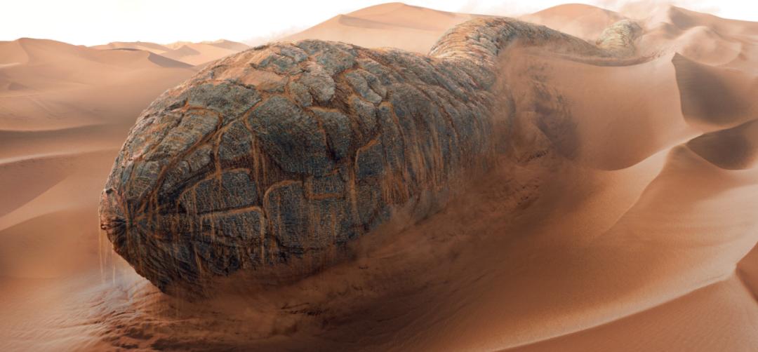 沙虫的身长可超过400米,据说沙丘星球的南北极,还存在体长超过1000米的沙虫。它们在沙子中浮潜、游弋,皮肤上覆盖着坚硬厚实的鳞片,保护身体不被沙子磨损。