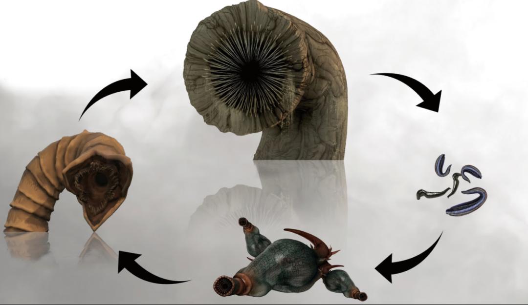 沙虫刚出生时非常微小,类似于现实里的浮游生物。这时它们以“香料”为食,长大一些后会变成沙鳟,类似于水蛭或蛞蝓。沙鳟的分泌物随着呼气从沙子中喷出,这些分泌物在阳光、空气的作用下会逐渐变成“香料”。