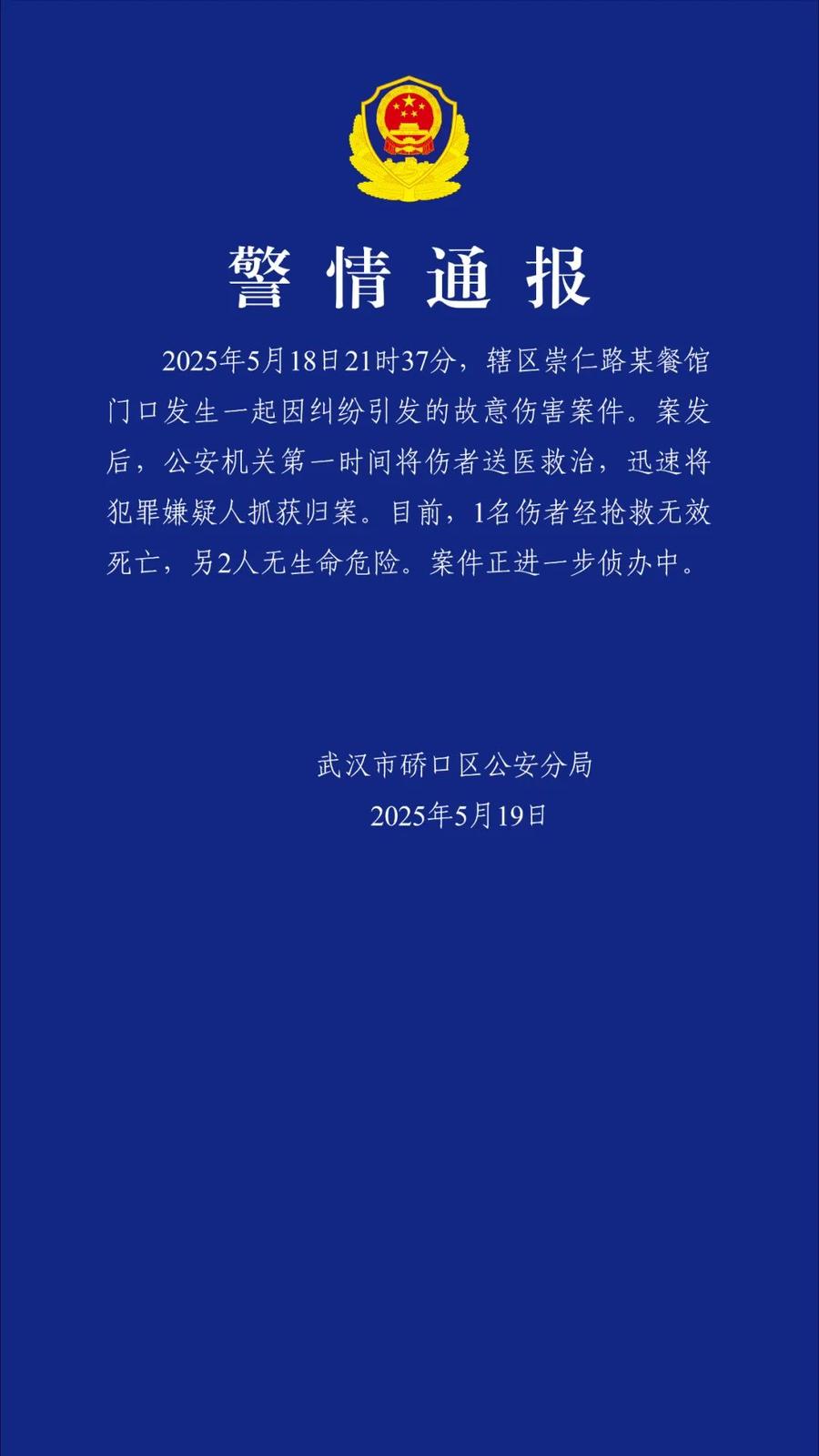19日中午,武汉硚口区公安分局发通报,指18日晚近10时,崇仁路某餐馆门口发生因纠纷引发的故意伤害案,造成1人抢救无效身亡,另外2名伤者无生命危险。警方已迅速拘捕疑犯,目前正在调查中。