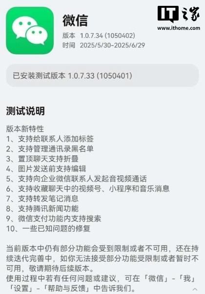 微信鸿蒙版今日还向邀测用户推送了 1.0.7.34 版本更新,该版本的更新内容和此前多个邀测版本的信息一致(1.0.7.16 版本开始)。