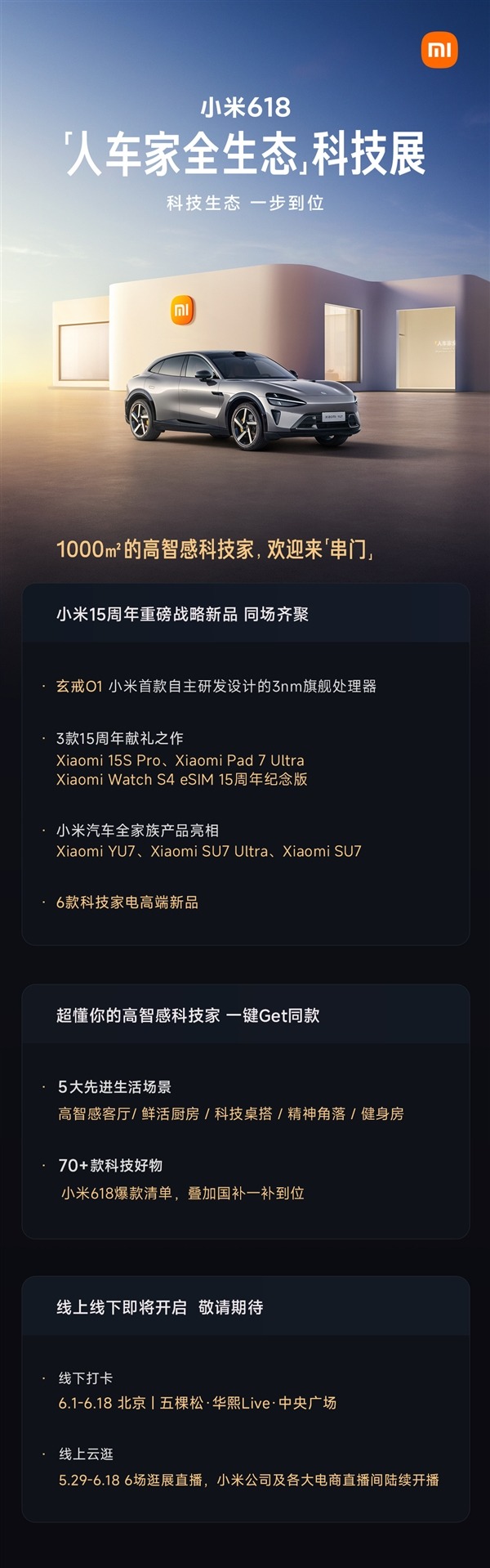 快科技5月27日消息,小米人车家全生态科技展今天正式官宣,将于6月1日-6月18日在北京五棵松·华熙Live·中央广场进行线下展出,号称是1000㎡的高智感科技家。