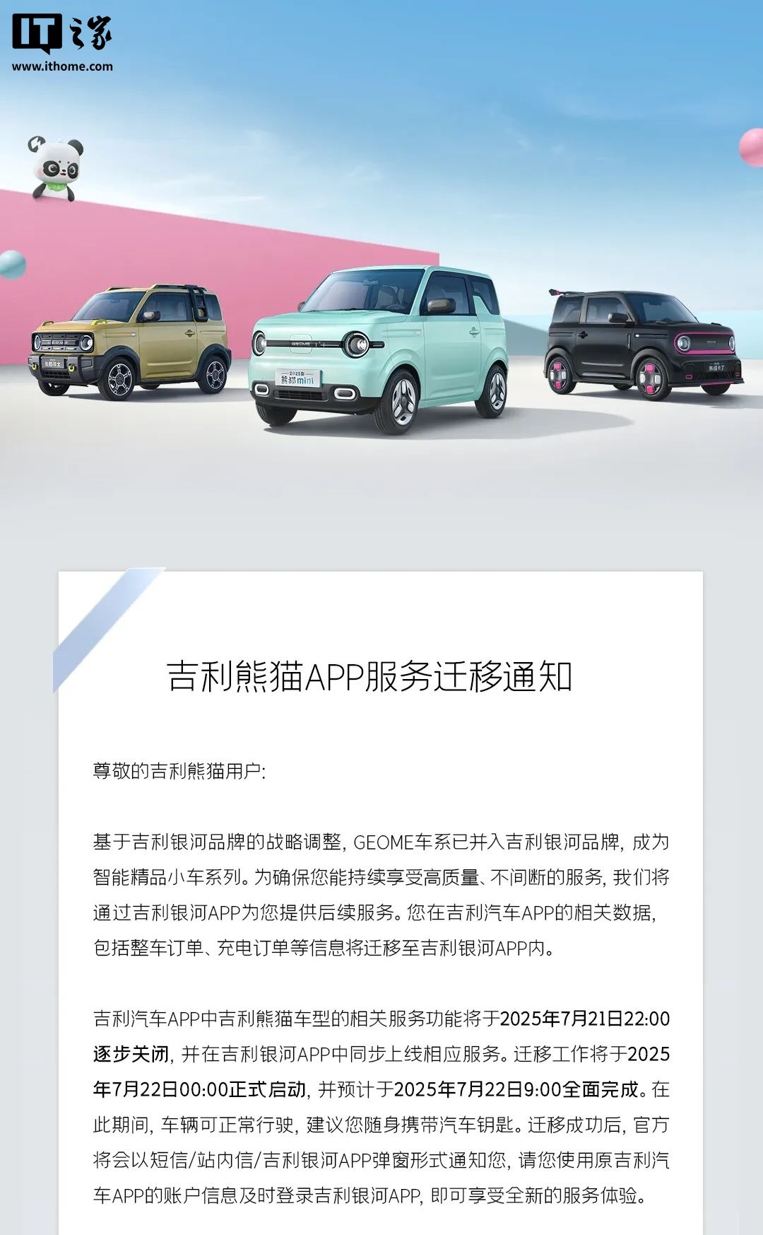 IT之家 7 月 4 日消息,吉利汽车今日发布吉利熊猫 App 服务迁移通知。